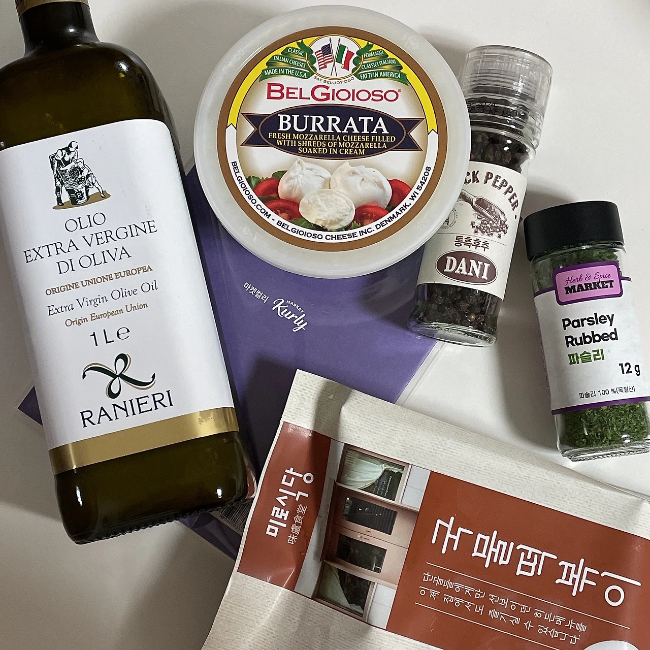 잔뜩 반토막 나있는 방울토마토 가운데에 우뚝 서 있는 흰색 덩어리는 부라타 치즈라고 했다. 한 통에 세네 개 정도 들어있으며, 유통기한이 생각보다 기니 한 번 도전해 볼 것을 제시하는 그녀에게 후추는 뭘 사야 하는지, 오일은 뭐고 파슬리는 어떤 걸 사야 하는지 말이 트인 3세 아이처럼 끊임없이 질문을 쏟았다. 늘 살 것처럼 묻고는 사지 않는 나의 게으른 소비에 대해 잘 아는 그녀와 나의 친구들은 어차피 안 살 거잖아 하는 눈빛으로 깔깔 웃었지만, 기어코 내일은 무용지물이었던 나의 마켓컬리 아이디를 사용해 보리라 다짐했다.