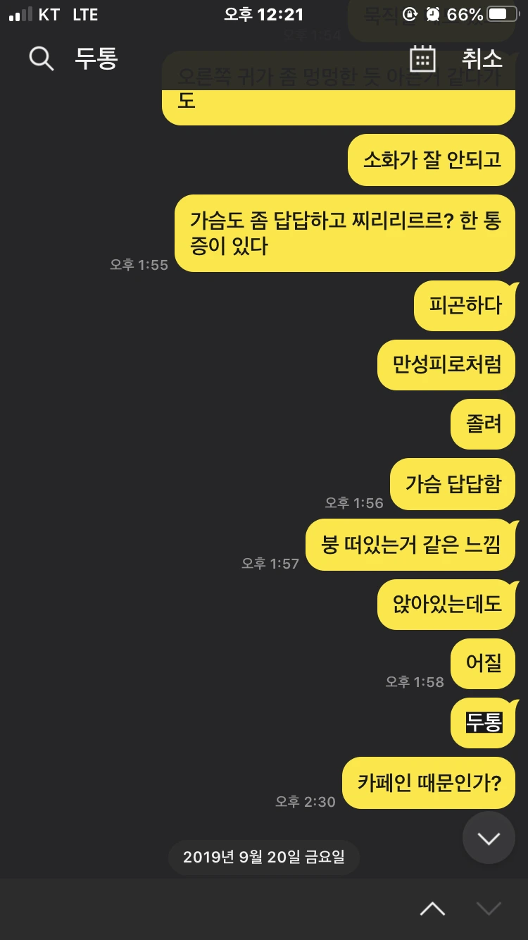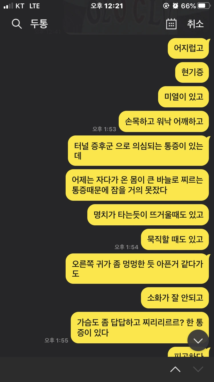 실비가 무색하게 병원에 가지 않는다. 병원 갈 돈으로 고기 사 먹는다. 스무 살 때 다리를 크게 접질려 삼선 슬리퍼 신고 학교 다니던 시절, 못 참고 한의원에 갔다. 일주일 만에 나았다. 병원에 가면 일주일, 안 가면 칠일 만에 낫는다는 얘기가 있다. 내 몸이 딱 그렇다. 굳이 안 간다. 어차피 듣는 얘기는 스트레스와 잘못된 식습관이다. 잔고가 마르지 않는 통장이 생기지 않는 한 계속될 스트레스고, 100세 누리고자 당장 먹을 밀가루를 끊을 순 없다. 다들 챙겨 맞는다는 독감백신 한 번 맞아본 적 없다. 그냥 이렇게도 살아진다. 담쌓고 지내니 의사 선생님 앞에 앉으면 낯을 가린다. 서먹하다. 어디가 안 좋으냐 묻는데, 어디부터 어떻게 얘기해야 할지 면접 보는 초년생처럼 입이 안 떨어진다. 작년 9월. 전에 없던 현기증으로 내과에 갔다. 2019년 첫 내원이었다. 간 김에 증상을 빠짐없이 말하고 싶은데 벙어리가 될 것이 뻔하기에 카톡에 증상을 쭉 적어 의사 선생님께 보여드렸다.