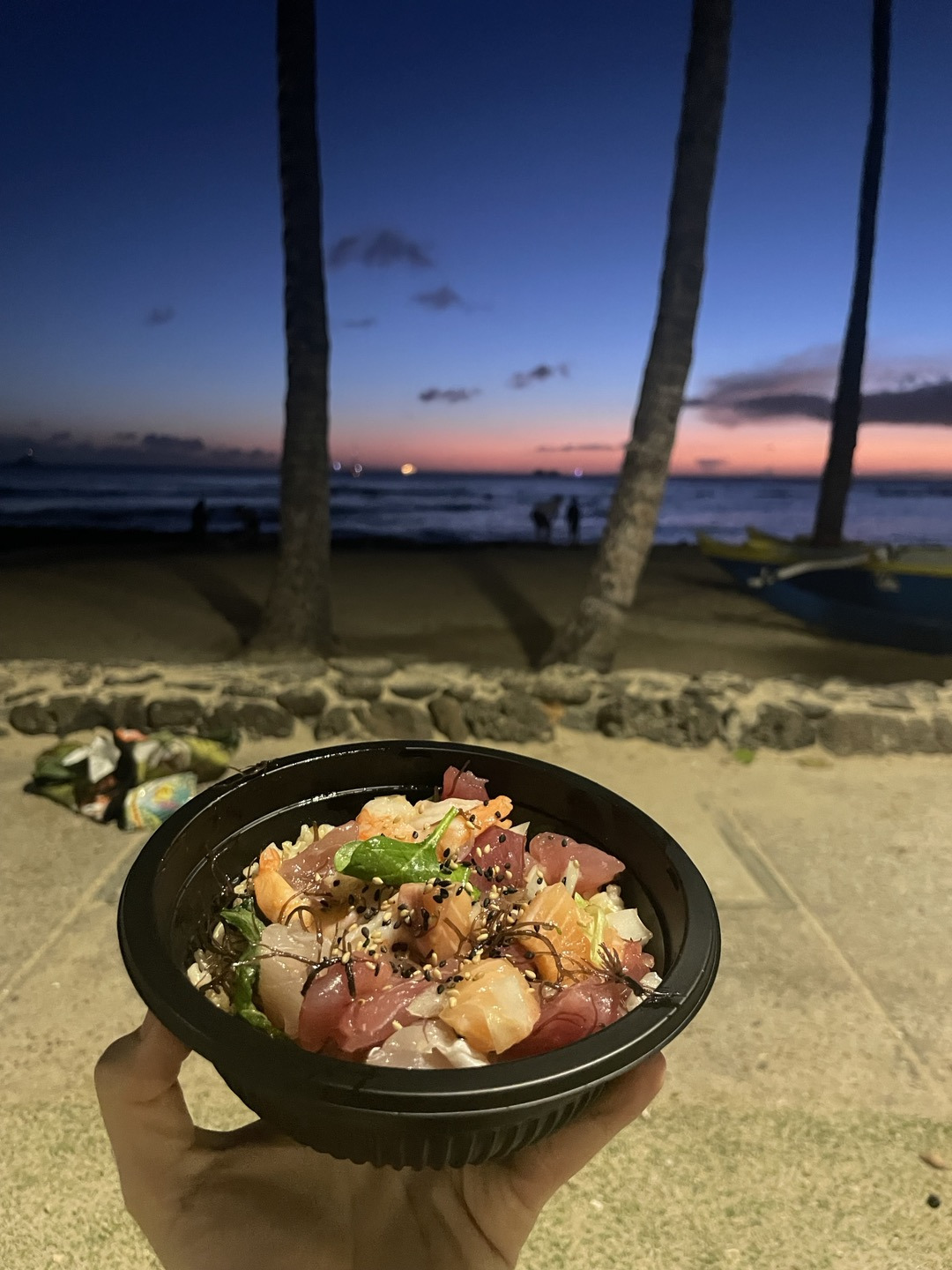 따뜻한 밥과 신선한 해산물의 조합이라... 신선했다. 내가 너무 기대를 했는지 생각보다 엄청난 맛은 아니었다. 하와이의 첫 음식으로 엄청난 설렘을 가지고 먹어서 그럴지도 모르겠다. 내일 다른 맛을 먹어보아야겠다는 생각을 하며 번쩍이는 호놀룰루 쇼핑 거리를 산책했다.