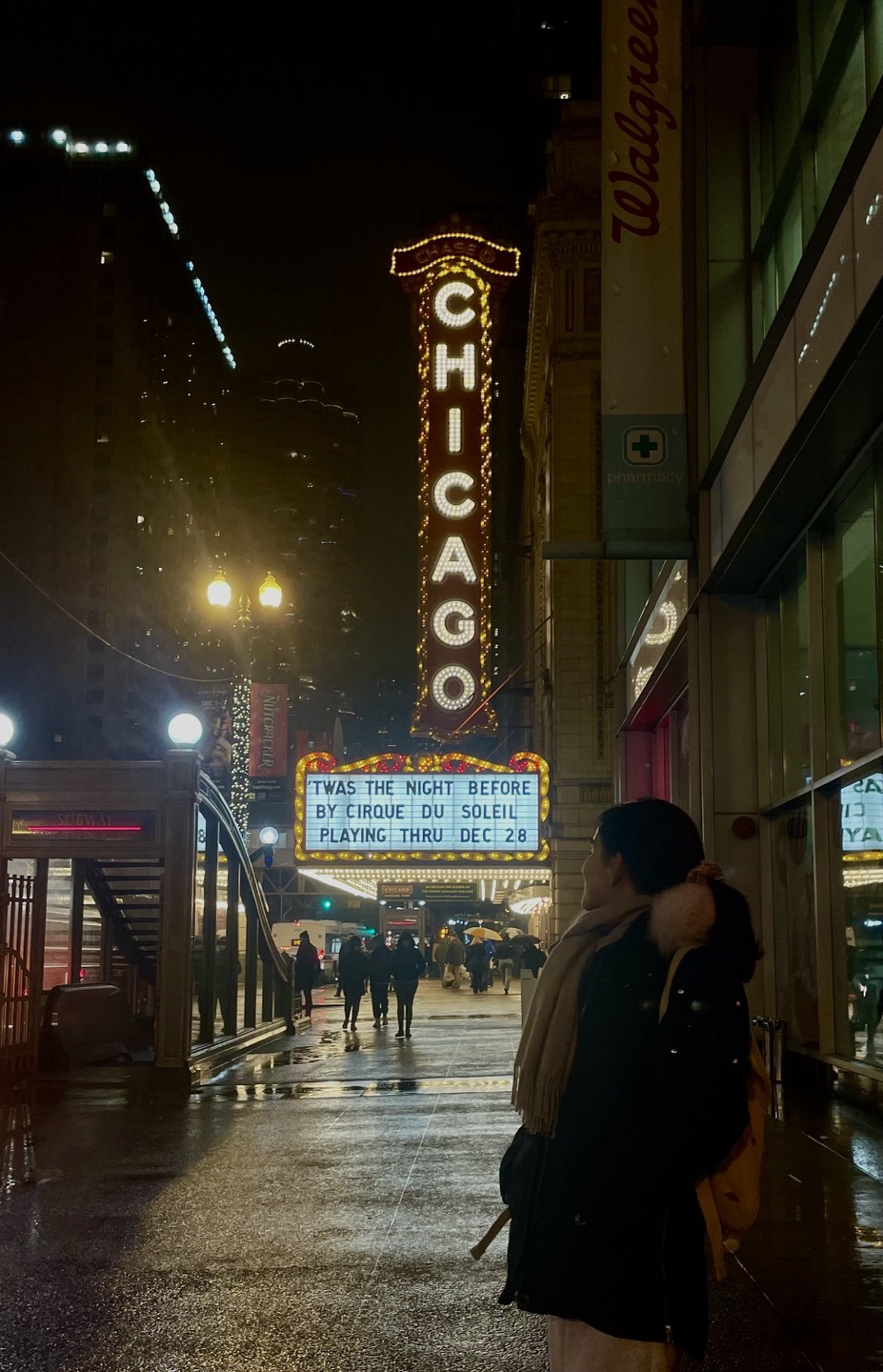 비록 비가 꽤 왔고 어두웠지만 많은 관광객들이 있어 안전한 것 같았다. 시카고에 온 두 번째 이유 시카고 극장간판. 비가 오니 오히려 운치가 있어 보였다. 비가 점점 세게 와 사진을 남기기 너무 쉽지 않았다. 당당히 어떤 분께 도움을 요청했다. 정말 만족스러운 사진이 나왔다. 소소한 행복함을 느꼈다.