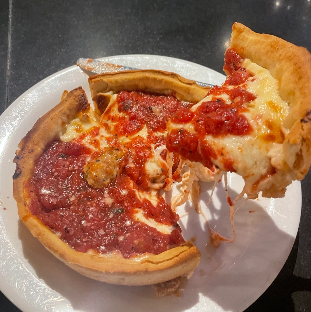 굶주린 배가 내 피자가 오는 것을 알아차렸는지 내가 뒤를 도니 누가 봐도 내 피자가 나를 향해 오고 있었다. 생각보다는 작은 크기에 실망했지만 엄청난 치즈양에 벌써 느끼한 맛이 느껴졌다. 와압하고 한입 크게 먹어보았다. 오, 이게 시카고 피자의 맛이구나. 치즈양과 비례하지 않는 느끼함. 생각보다 너무 맛있었다. 소시지는 약간 향신료 맛이 났다. 처음에는 좀 당황했지만 오히려 토마토소스와 어울리는 맛이었다. 야무지게 먹고 이제 시카고의 분위기를 느껴보기 위해 나왔다.