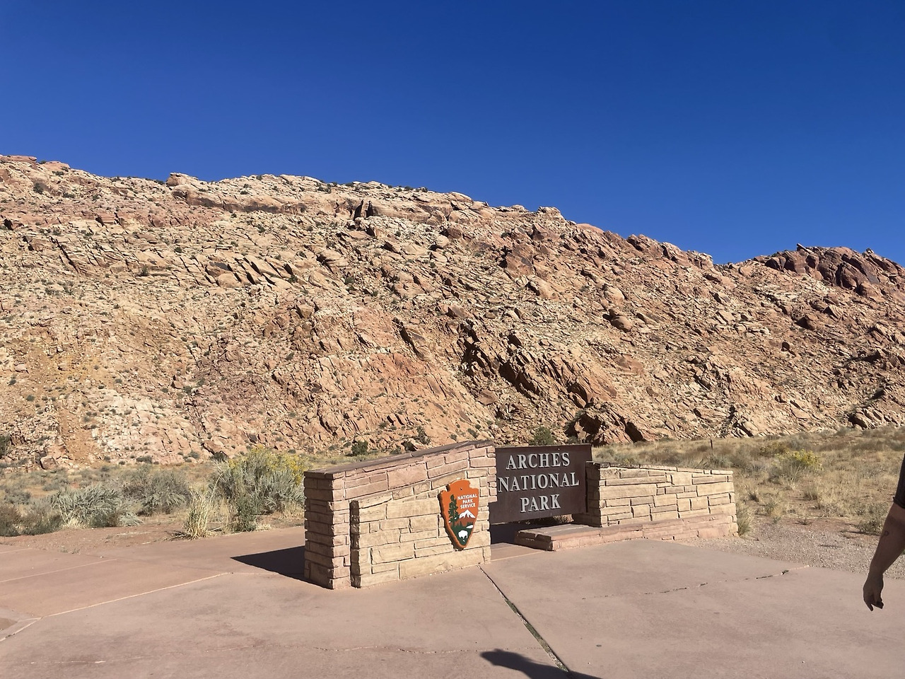 내 대학교가 있는 Ogden에서 남쪽으로 무려 4시간이나 차를 타고 가야 Visitor Center에 도착한다. 같은 UT이지만 UT의 크기가 대한민국보다 크기에 무려 왕복 9시간을 가야 한다. 새벽에 출발해서 밥 먹고 하다 보니 약 오전 11시쯤에 도착했다. 아치스 국립공원은 미리 입장권을 구매해야 한다. 이 평일 오전시간에도 아치스 국립공원에 들어가려는 줄이 엄청났다. 관광객답게 Arches National Park 표지판에서 사진을 남겼다.