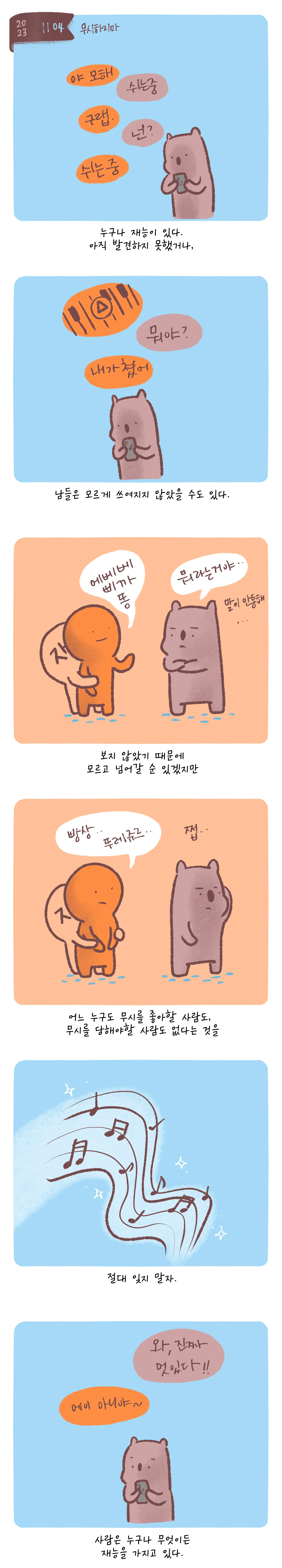 <섭섭하지 않은 쿼카>그림일기 웹툰 작가이자 운동을 좋아하는 일러스트레이터입니다. 따뜻한 그림을 그리고 싶습니다. 작가님의 글에 따뜻함을 더하고 싶으신분들은 제안해주세요.