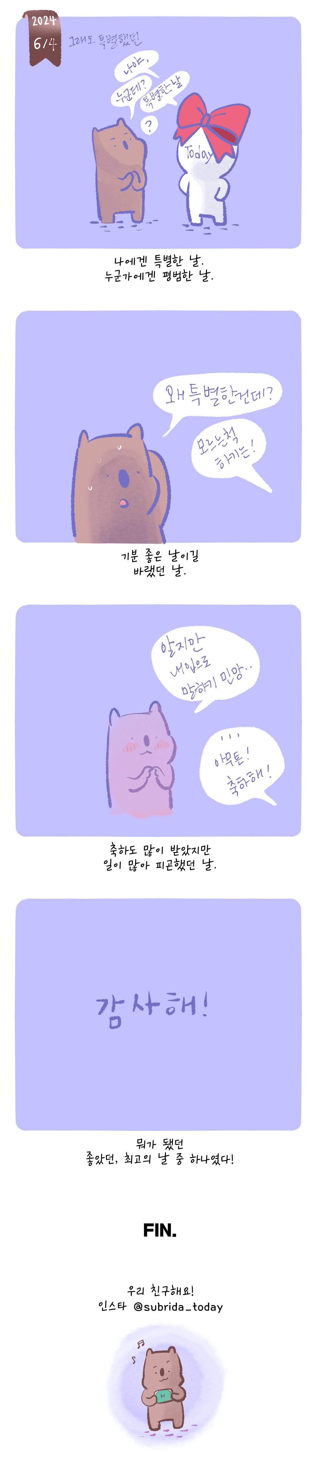 <섭섭하지 않은 쿼카>그림일기 웹툰 작가이자 운동을 좋아하는 일러스트레이터입니다. 따뜻한 그림을 그리고 싶습니다. 작가님의 글에 따뜻함을 더하고 싶으신분들은 제안해주세요.