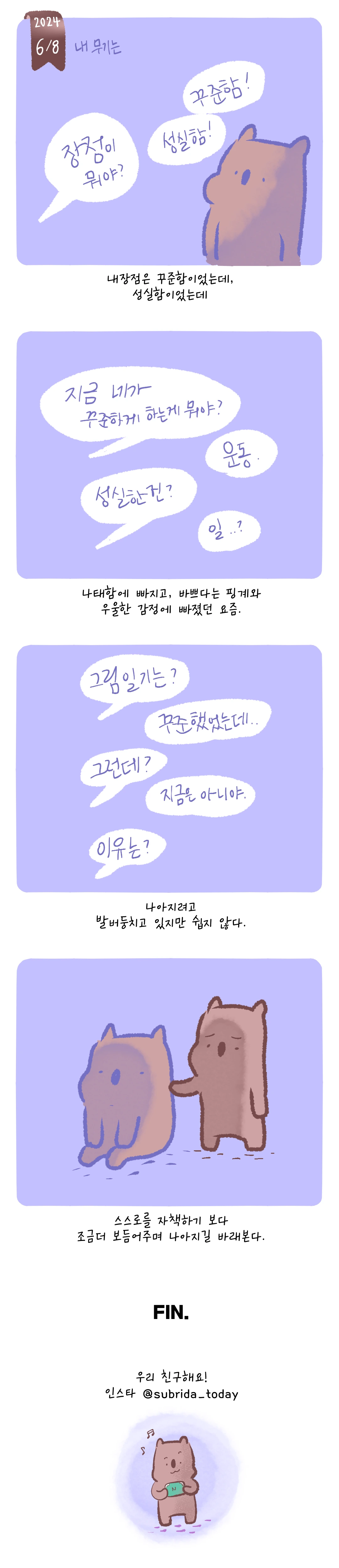 <섭섭하지 않은 쿼카>그림일기 웹툰 작가이자 운동을 좋아하는 일러스트레이터입니다. 따뜻한 그림을 그리고 싶습니다. 작가님의 글에 따뜻함을 더하고 싶으신분들은 제안해주세요.