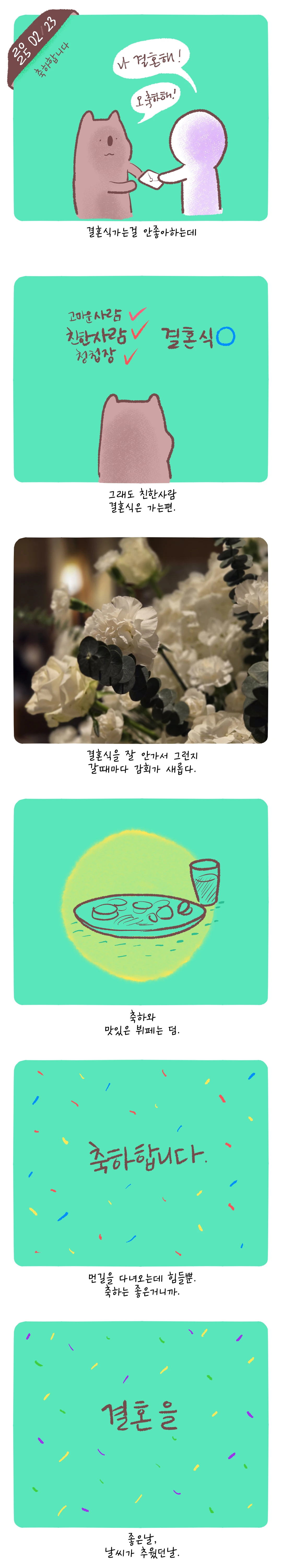 비혼주의라돌려받지 못할 돈이 라 생각이 들어결혼식엔 잘 안 다려하는데그래도 친하고 고마웠던 지인들 결혼식은 가는 편.친한 만큼 축하해주고 싶은 마음이 크니까.감사했던 마음 이렇게라도 갚고 싶으니까.어쨌든 좋은 날축하하니 좋았던 날바람이 차서 추웠던 날.