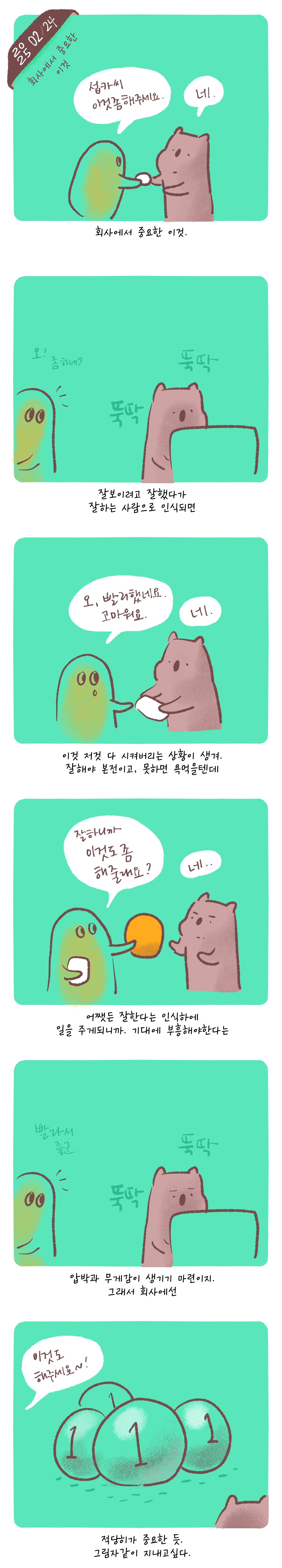 회사에서 중요한 건 이것.뭐가 제일 중요할까.정말 사회 아니면다른 어느 곳엘 가도 통영 될 것 같다.더도 말고 덜도 말고중간만 하자.중간만 딱.잘하면 잘하는 만큼 쉬는 시간이 생겨야 하는데잘한 만큼 시간이 남으면 다른 일이 추가된다.아.피곤하다.