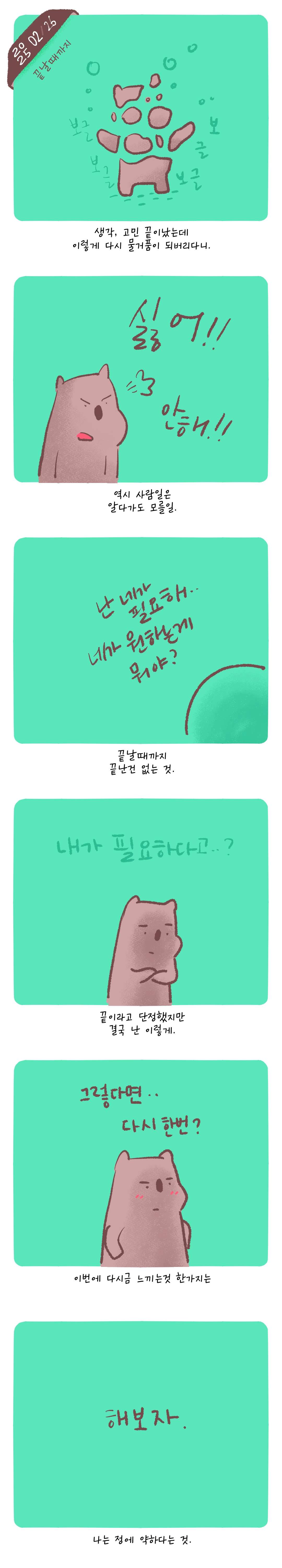 끝날 때까지 끝난 게아니라는 말이 있다.생각도고민도 끝났었는데설득당해 버렸다.끝나고 생각했는데다시 희망점이 보인 것 같은 느낌.아직 희미하다.다시 잘 버텨볼 지팡이를 찾아야 한다.해보자.흔들리지 말자. 제발.