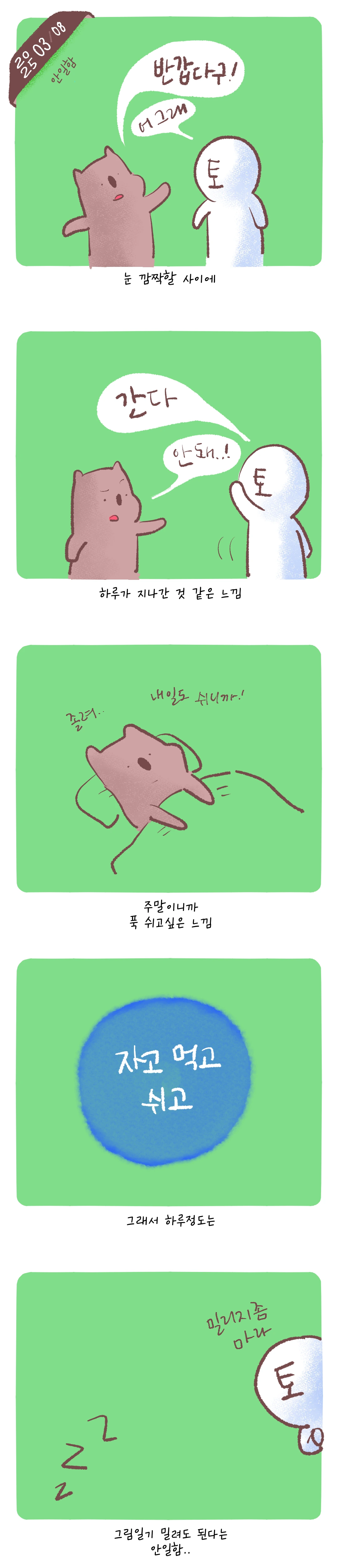 쉬는 날 쉬는 건 좋은데할 건 하고쉬는 건 어떨까.쉰다는 편안함에 취해할 것도 안 하고 쉬기만 하지 말고 말이다.앞으로는 조금 더 신경 쓰기로.