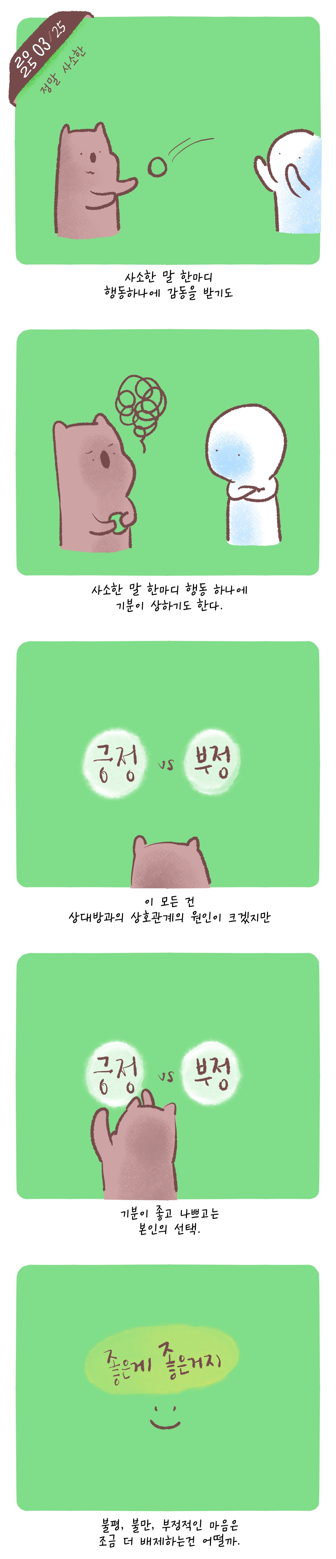 정말 사소한 한 가지두 가지가하루를 좌우하곤 한다.좋은 건 얼마 안 가는데꼭 안 좋은 건 참 오래도 가지.모든 건 마음먹기 나름이라고생각하기 나름이라고알면서쉽지 않다.긍정과 부정의 선택.좋고 나쁨의 선택.