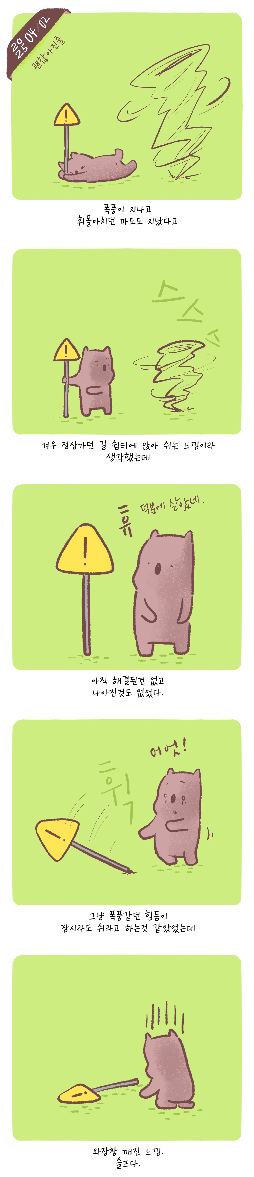 폭풍우 같은 하루하루 속단비 같았고기둥 같았고휴식처 같았던그런 현실에 감사했던모든 것들이 깨진 느낌이다.내가 뭐라고누구에게 기대고바라고 원하는지.