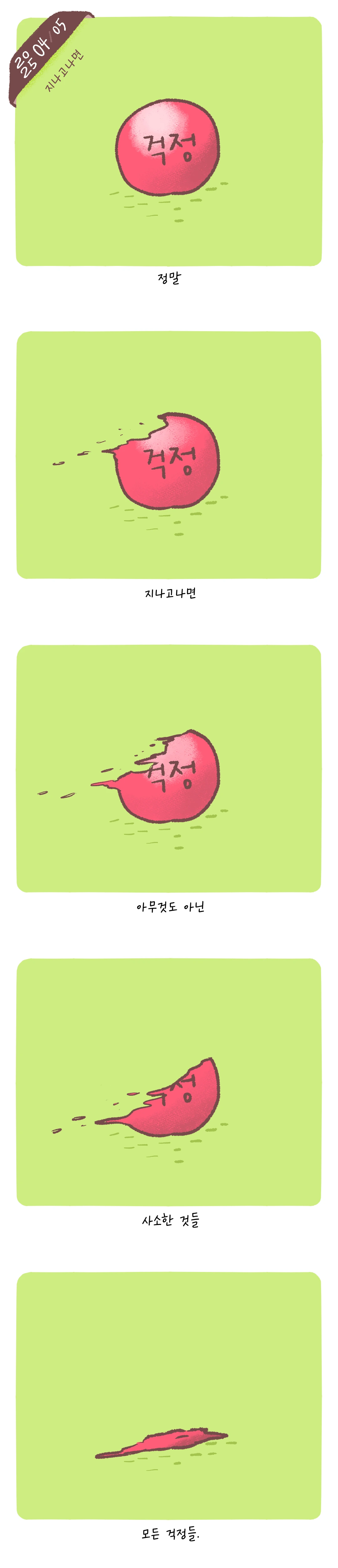지나고 나면아무것도 아닌,아무것도 아닌 게 돼버리는걱정.어떻게 될지는신 말고는 아무도 모르니까.미리불안해하고부정적인 걱정들은하지 말기로.최대한 안 하기로.해보자.