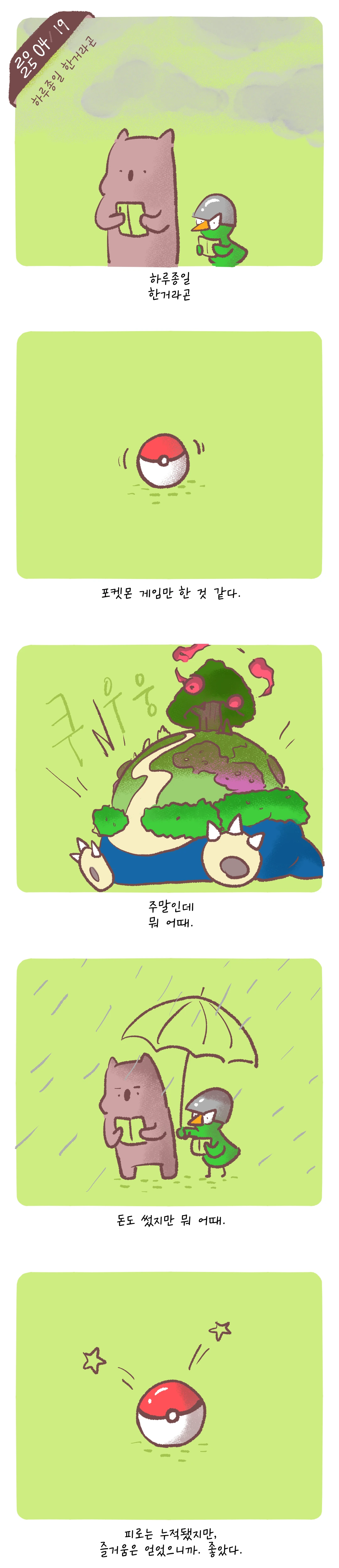 오늘은 포켓몬고 이벤트날.사람이 많이 모여야 잡을 수 있는 강한 포켓몬을 잡기 위해강남으로 출두.이벤트날엔 언제나 사람이 한가득.평소엔 볼 수 없던 포고인들이 여기저기.다 함께 이벤트를 즐겼던 오늘.날이 좋지 않아비를 맞으며 버겁게 했던 오늘.그래도 재미있었으니 됐다.