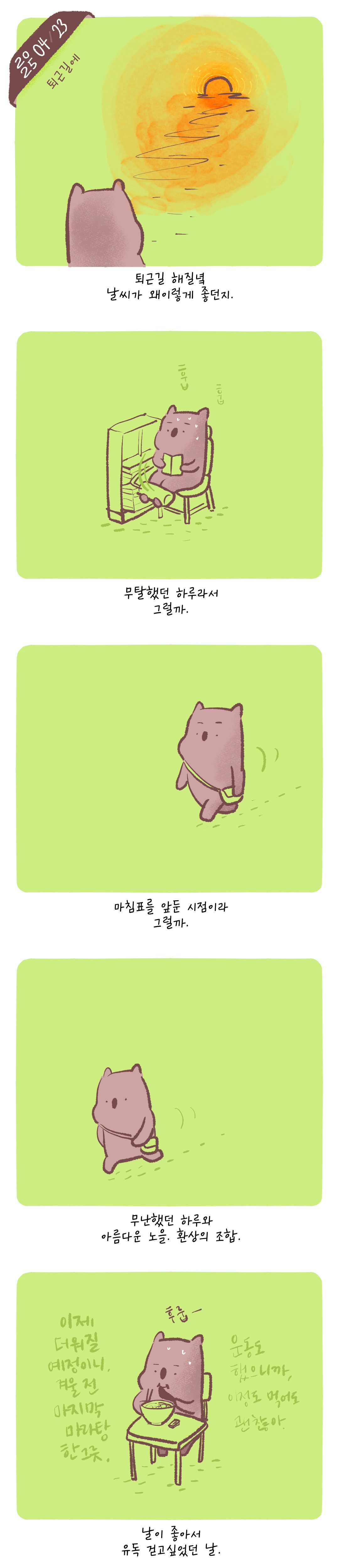 퇴근길에날씨가 너무 좋아서괜히걷고 싶었던 날.이제 점점 더워질 거니까다시 쌀쌀해지기 전 마지막 마라탕을 호로록.맛있다 맛있어.
