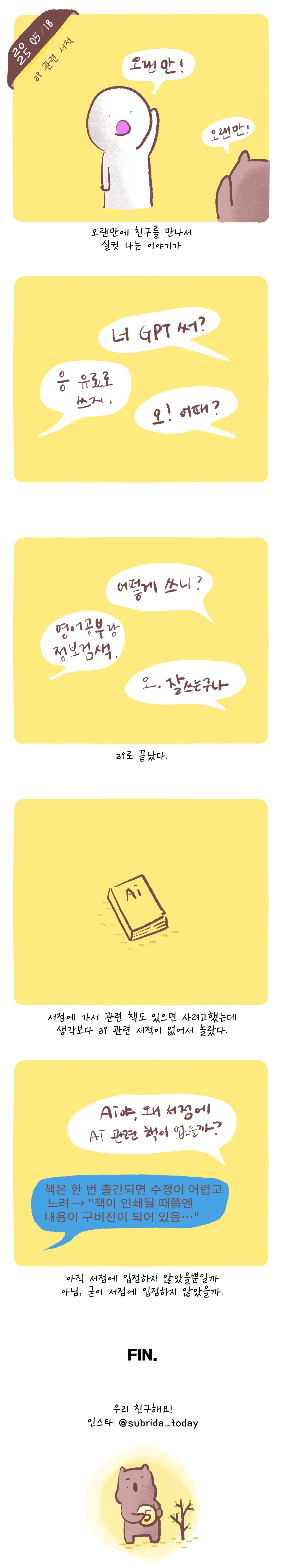 나의 관심사가 ai니까오랜만에 만난 친구와도 ai 대화.친구도 ai를 쓰고있으니대화가 청산유수.말나온김에밖에나온김에 서점가서 ai관련 서적도 찾아보고괜찮으면 사려고 했는데없네.