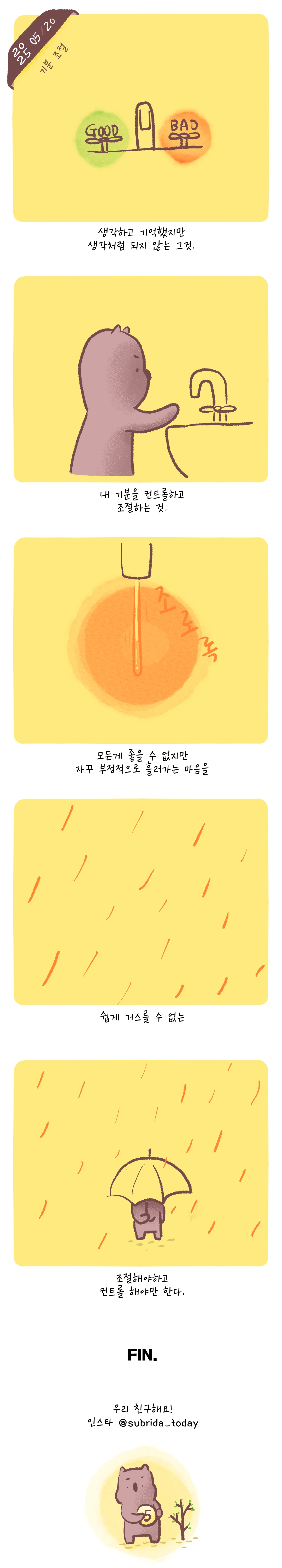 내 기분내가 조절하는 게 쉬운 듯쉽지 않은 게상황에 따라환경에 따라특히 타인에 따라달라지기 쉬운 부분이라.좋은 게 좋은 거라고모든 것엔 이유가 있는 거라는데.나 또한 기분이 좋고 나쁨에 이유가 있으니괜찮은 걸까.다시 시작하기로 한 첫날.기분이 참 오묘했던 마침표였다.