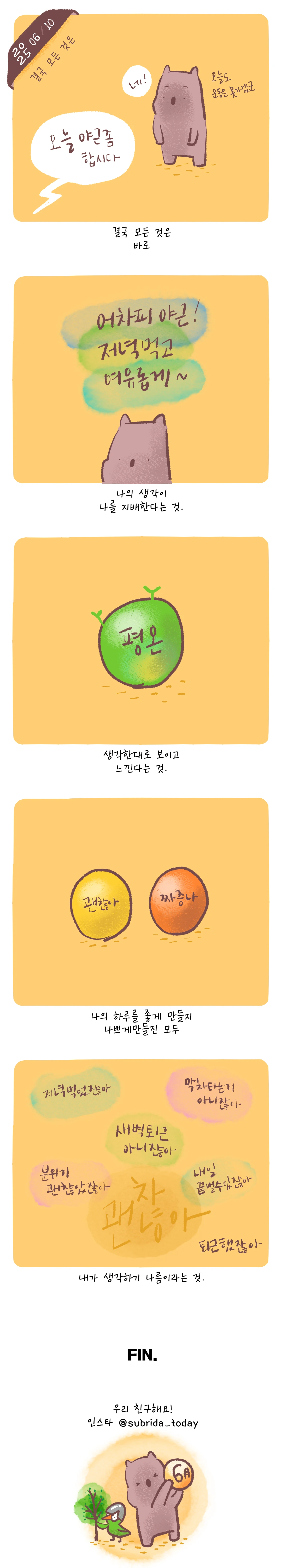 결국모든 것은나로부터.내 생각으로부터.내가 생각을 지배하면모든 게 달라진다는 것을.알면서그게 참 어렵지.그래도 오늘은 잘 컨트롤했어.