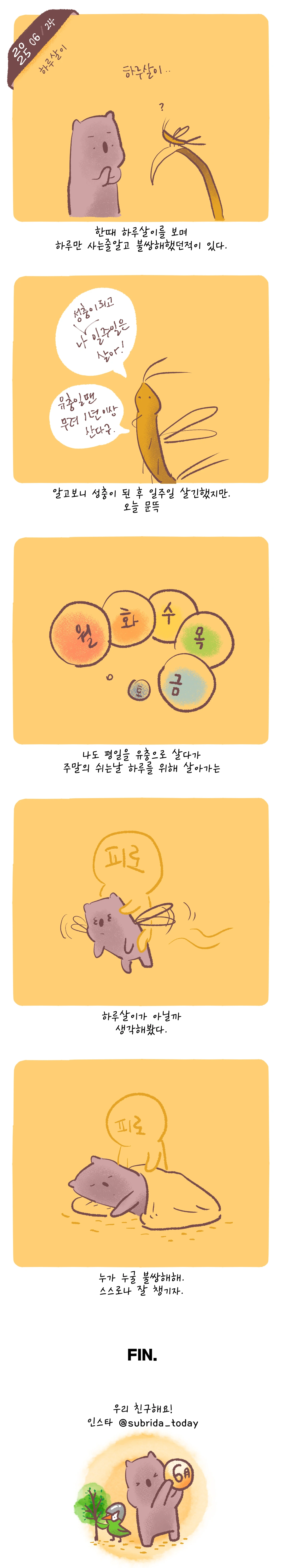 하루살이.벌레가 아닌내가 하루살이는 아니었을까.누굴 걱정하기 전에나부터 잘 케어해야 하지 않을까.오늘도 하루살이 유충 같은 나는 도약하기 위한하루를 버티고 이겨내 간다.