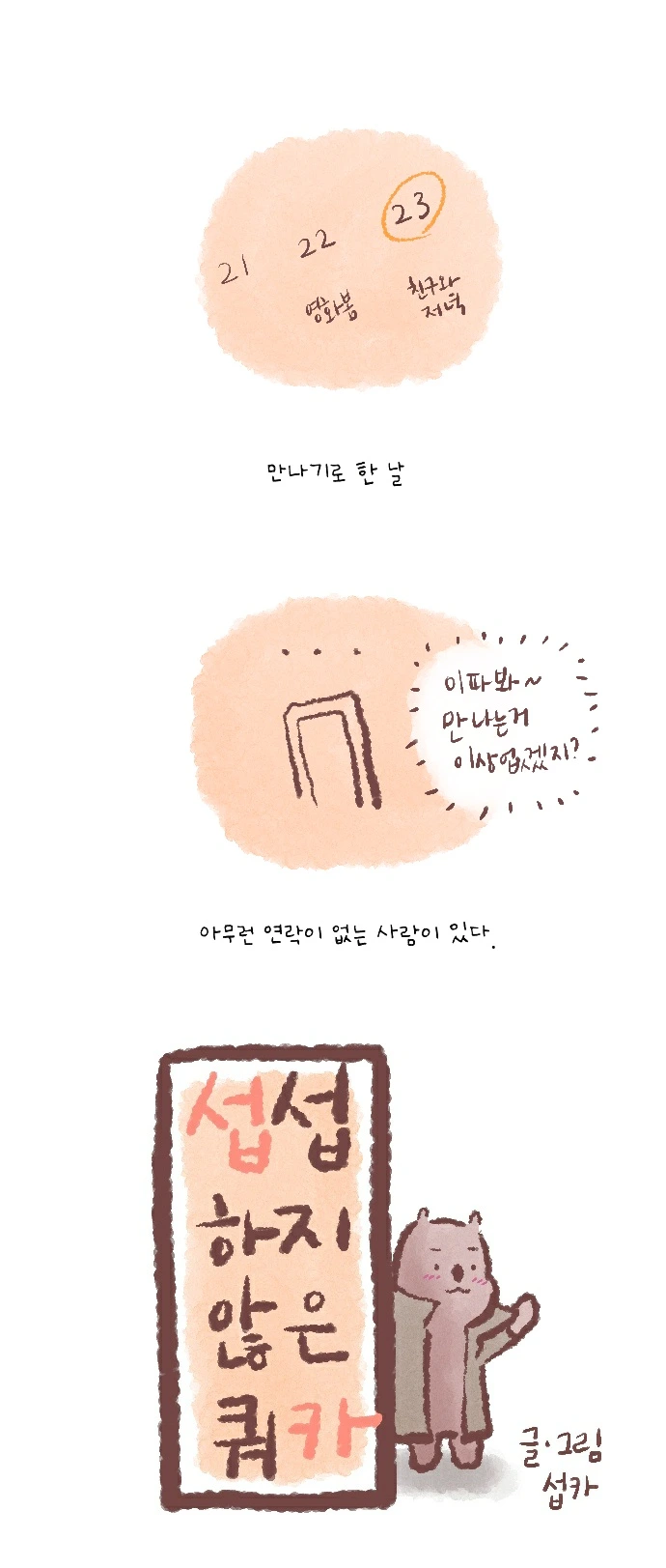 <섭섭하지 않은 쿼카>그림일기 웹툰 작가이자 운동을 좋아하는 일러스트레이터입니다. 따뜻한 그림을 그리고 싶습니다. 작가님의 글에 따뜻함을 더하고 싶으신분들은 제안해주세요.