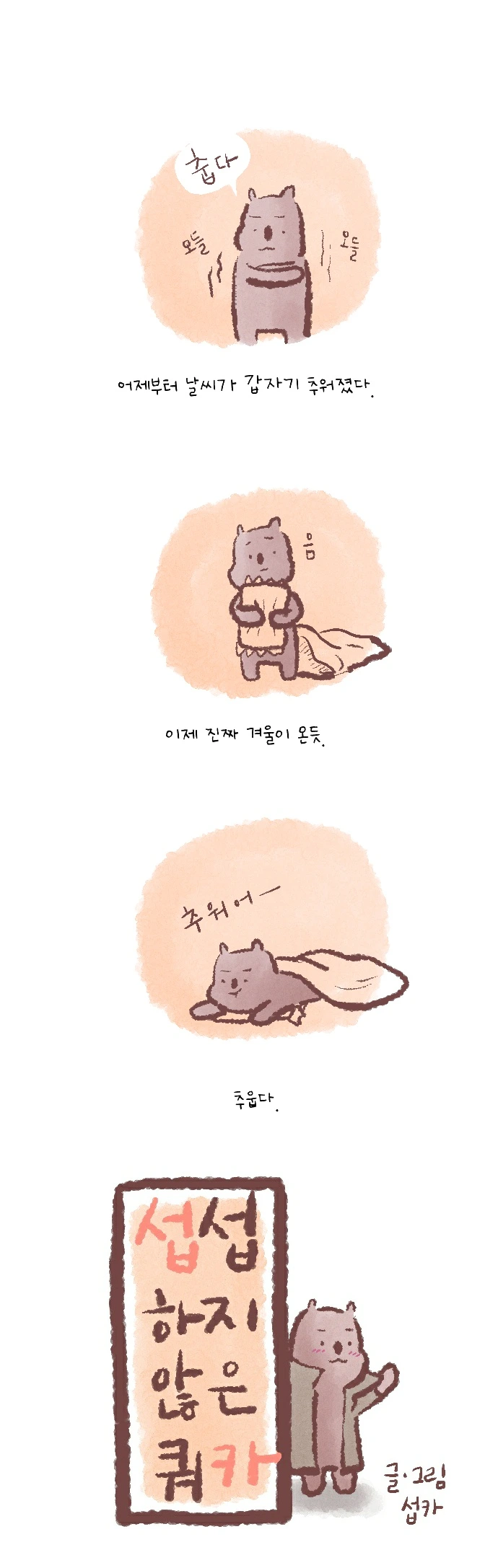 <섭섭하지 않은 쿼카>그림일기 웹툰 작가이자 운동을 좋아하는 일러스트레이터입니다. 따뜻한 그림을 그리고 싶습니다. 작가님의 글에 따뜻함을 더하고 싶으신분들은 제안해주세요.