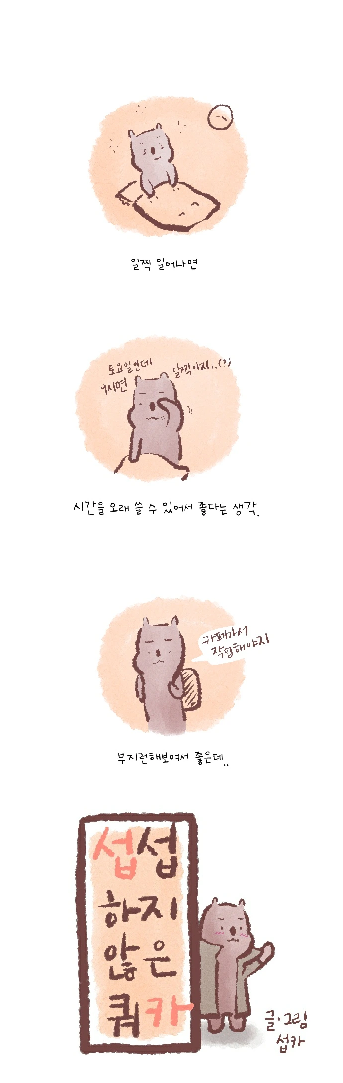 <섭섭하지 않은 쿼카>그림일기 웹툰 작가이자 운동을 좋아하는 일러스트레이터입니다. 따뜻한 그림을 그리고 싶습니다. 작가님의 글에 따뜻함을 더하고 싶으신분들은 제안해주세요.