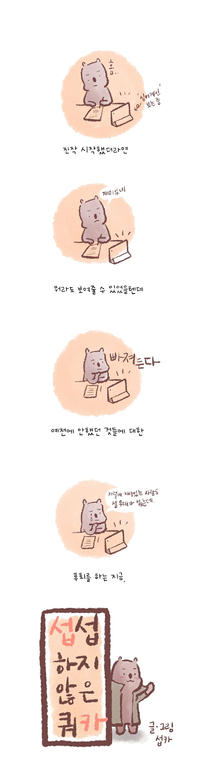 <섭섭하지 않은 쿼카>그림일기 웹툰 작가이자 운동을 좋아하는 일러스트레이터입니다. 따뜻한 그림을 그리고 싶습니다. 작가님의 글에 따뜻함을 더하고 싶으신분들은 제안해주세요.