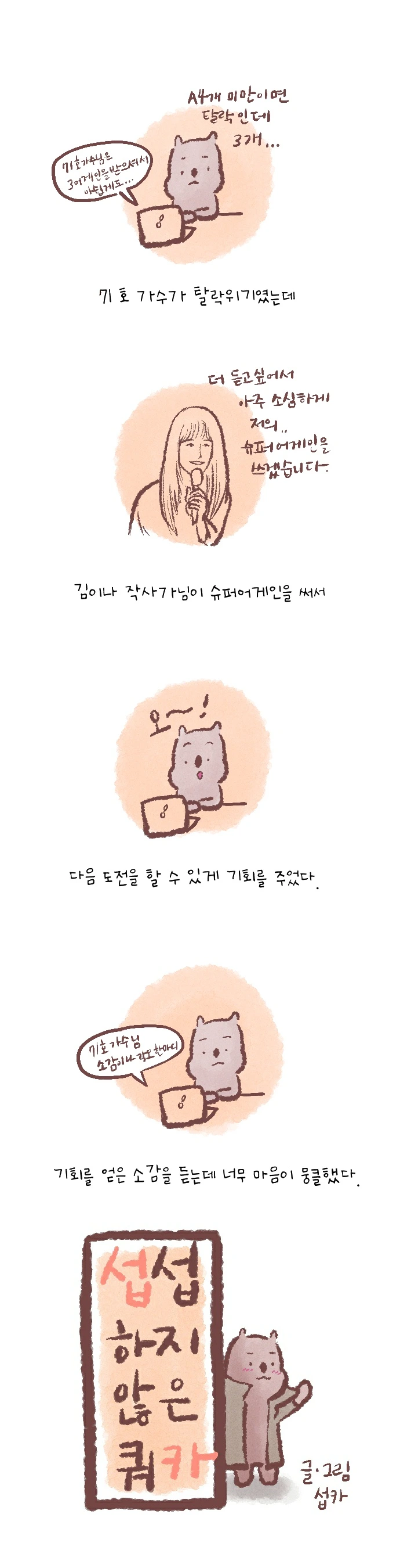 <섭섭하지 않은 쿼카>그림일기 웹툰 작가이자 운동을 좋아하는 일러스트레이터입니다. 따뜻한 그림을 그리고 싶습니다. 작가님의 글에 따뜻함을 더하고 싶으신분들은 제안해주세요.