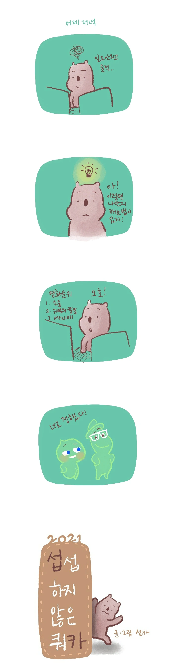 <섭섭하지 않은 쿼카>그림일기 웹툰 작가이자 운동을 좋아하는 일러스트레이터입니다. 따뜻한 그림을 그리고 싶습니다. 작가님의 글에 따뜻함을 더하고 싶으신분들은 제안해주세요.