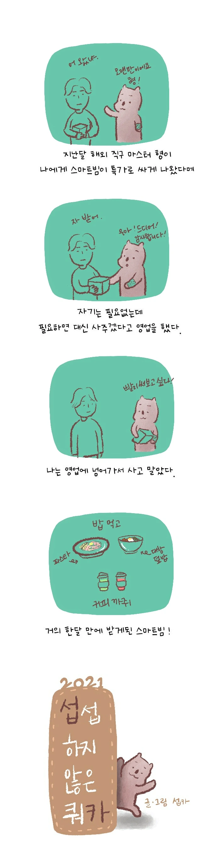 <섭섭하지 않은 쿼카>그림일기 웹툰 작가이자 운동을 좋아하는 일러스트레이터입니다. 따뜻한 그림을 그리고 싶습니다. 작가님의 글에 따뜻함을 더하고 싶으신분들은 제안해주세요.
