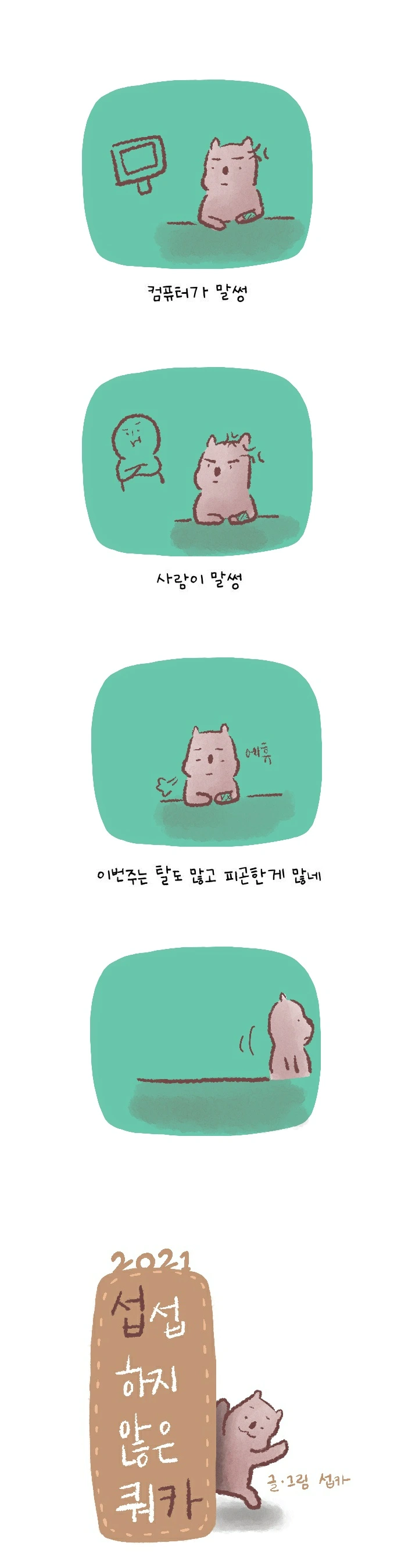 <섭섭하지 않은 쿼카>그림일기 웹툰 작가이자 운동을 좋아하는 일러스트레이터입니다. 따뜻한 그림을 그리고 싶습니다. 작가님의 글에 따뜻함을 더하고 싶으신분들은 제안해주세요.