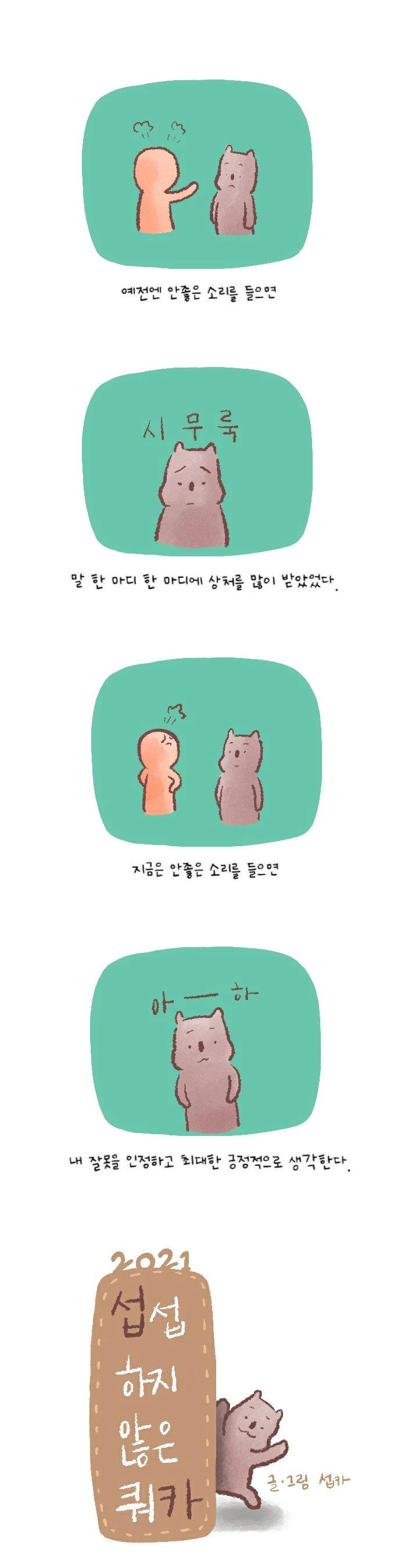 <섭섭하지 않은 쿼카>그림일기 웹툰 작가이자 운동을 좋아하는 일러스트레이터입니다. 따뜻한 그림을 그리고 싶습니다. 작가님의 글에 따뜻함을 더하고 싶으신분들은 제안해주세요.