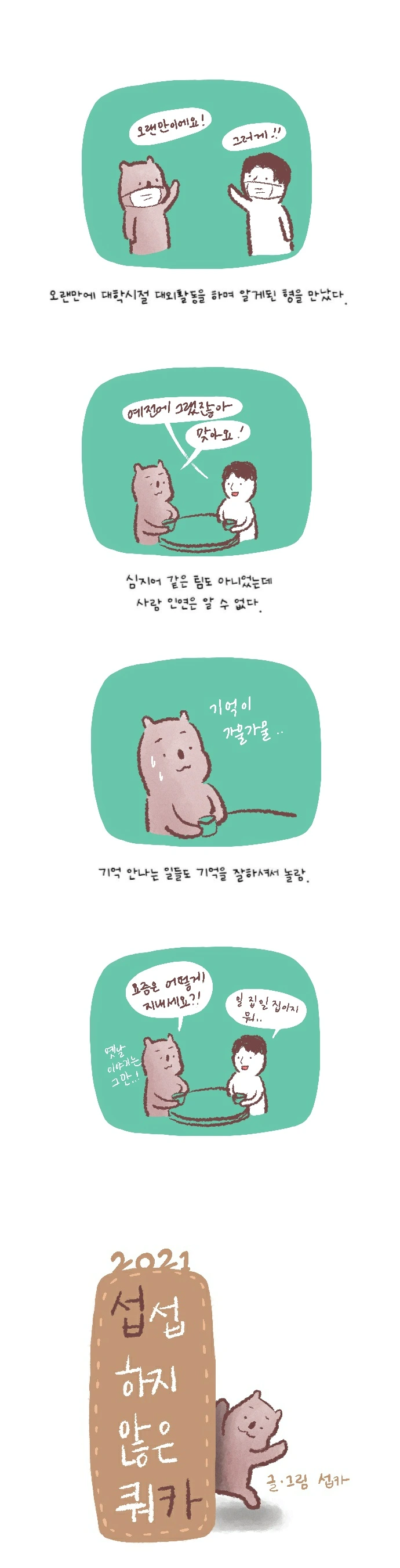 <섭섭하지 않은 쿼카>그림일기 웹툰 작가이자 운동을 좋아하는 일러스트레이터입니다. 따뜻한 그림을 그리고 싶습니다. 작가님의 글에 따뜻함을 더하고 싶으신분들은 제안해주세요.