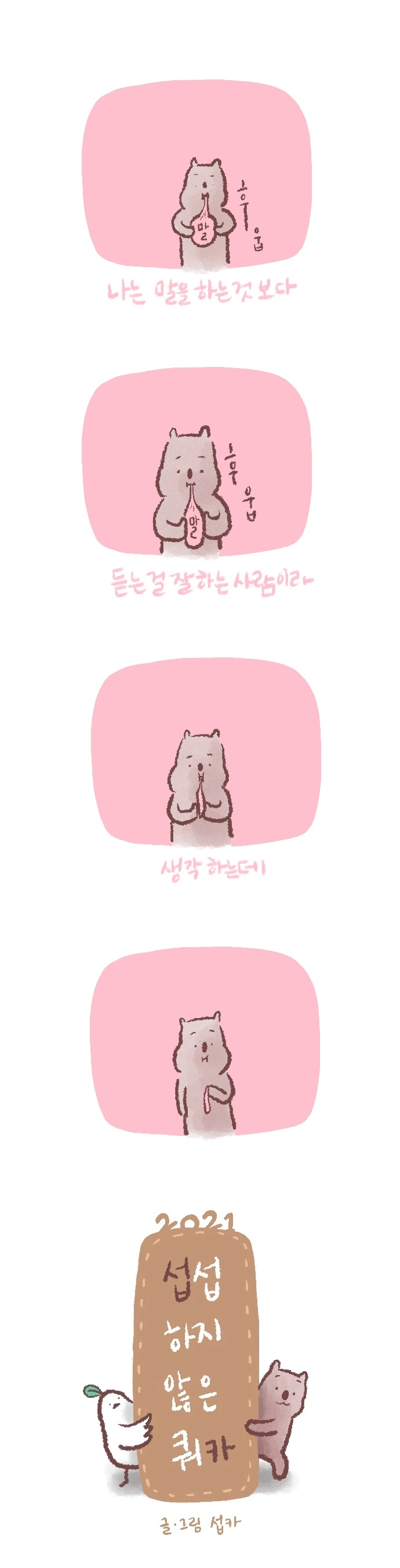 <섭섭하지 않은 쿼카>그림일기 웹툰 작가이자 운동을 좋아하는 일러스트레이터입니다. 따뜻한 그림을 그리고 싶습니다. 작가님의 글에 따뜻함을 더하고 싶으신분들은 제안해주세요.