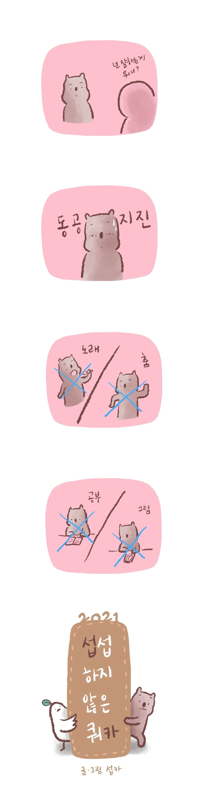 <섭섭하지 않은 쿼카>그림일기 웹툰 작가이자 운동을 좋아하는 일러스트레이터입니다. 따뜻한 그림을 그리고 싶습니다. 작가님의 글에 따뜻함을 더하고 싶으신분들은 제안해주세요.