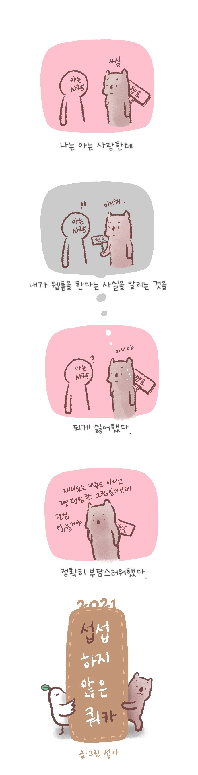 <섭섭하지 않은 쿼카>그림일기 웹툰 작가이자 운동을 좋아하는 일러스트레이터입니다. 따뜻한 그림을 그리고 싶습니다. 작가님의 글에 따뜻함을 더하고 싶으신분들은 제안해주세요.