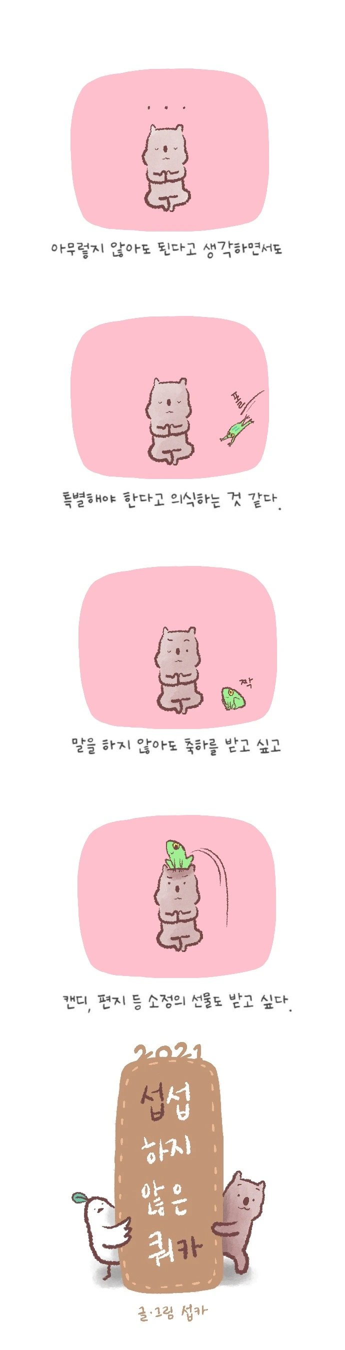 <섭섭하지 않은 쿼카>그림일기 웹툰 작가이자 운동을 좋아하는 일러스트레이터입니다. 따뜻한 그림을 그리고 싶습니다. 작가님의 글에 따뜻함을 더하고 싶으신분들은 제안해주세요.