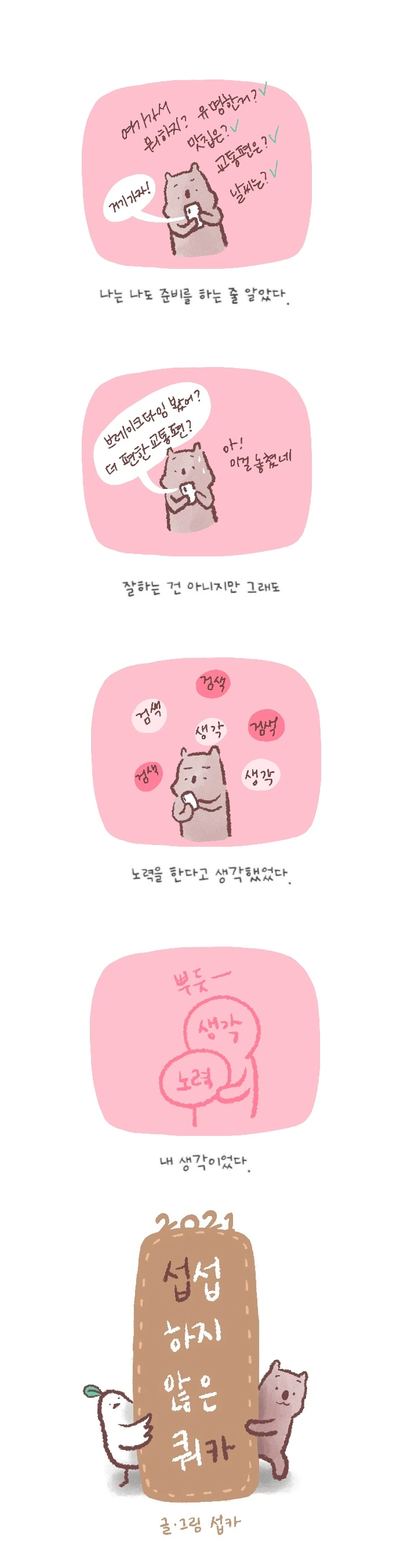 <섭섭하지 않은 쿼카>그림일기 웹툰 작가이자 운동을 좋아하는 일러스트레이터입니다. 따뜻한 그림을 그리고 싶습니다. 작가님의 글에 따뜻함을 더하고 싶으신분들은 제안해주세요.