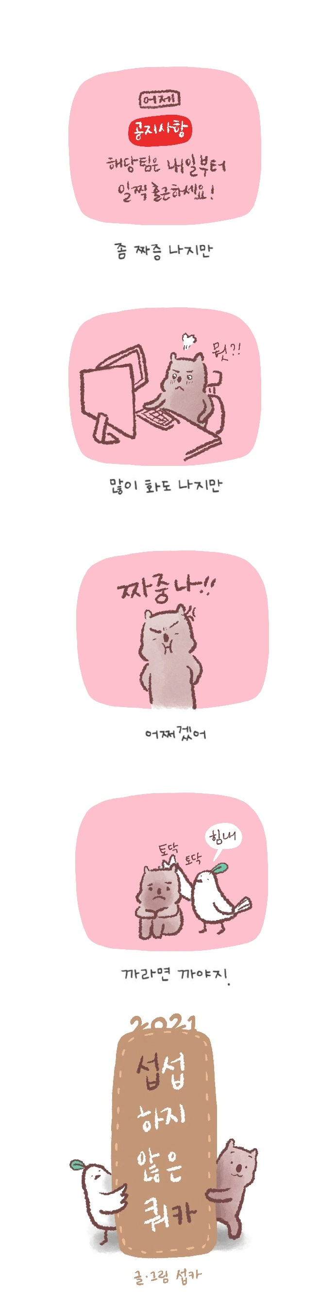 <섭섭하지 않은 쿼카>그림일기 웹툰 작가이자 운동을 좋아하는 일러스트레이터입니다. 따뜻한 그림을 그리고 싶습니다. 작가님의 글에 따뜻함을 더하고 싶으신분들은 제안해주세요.