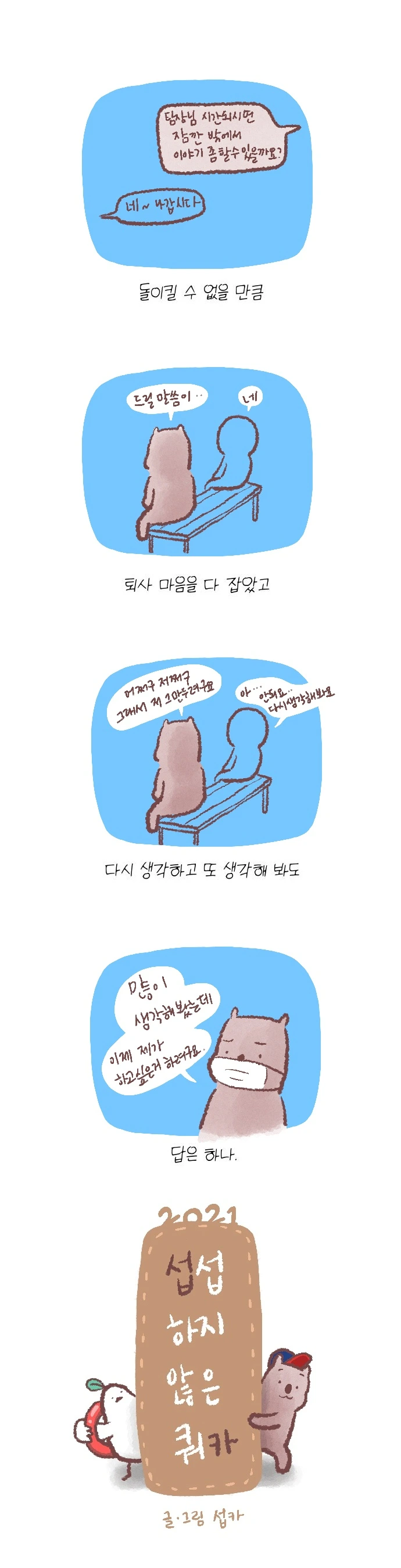 <섭섭하지 않은 쿼카>그림일기 웹툰 작가이자 운동을 좋아하는 일러스트레이터입니다. 따뜻한 그림을 그리고 싶습니다. 작가님의 글에 따뜻함을 더하고 싶으신분들은 제안해주세요.