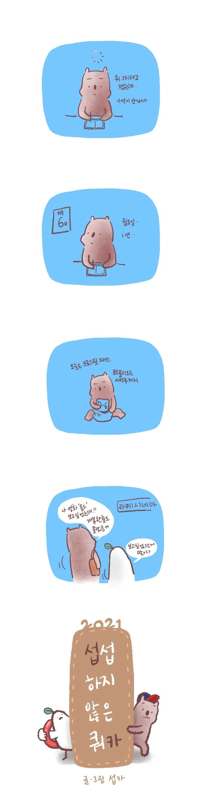 <섭섭하지 않은 쿼카>그림일기 웹툰 작가이자 운동을 좋아하는 일러스트레이터입니다. 따뜻한 그림을 그리고 싶습니다. 작가님의 글에 따뜻함을 더하고 싶으신분들은 제안해주세요.