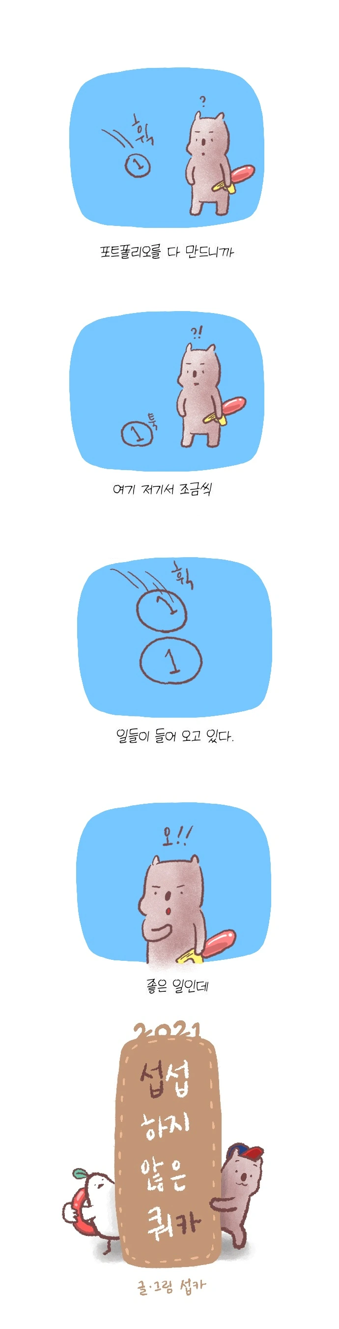 <섭섭하지 않은 쿼카>그림일기 웹툰 작가이자 운동을 좋아하는 일러스트레이터입니다. 따뜻한 그림을 그리고 싶습니다. 작가님의 글에 따뜻함을 더하고 싶으신분들은 제안해주세요.