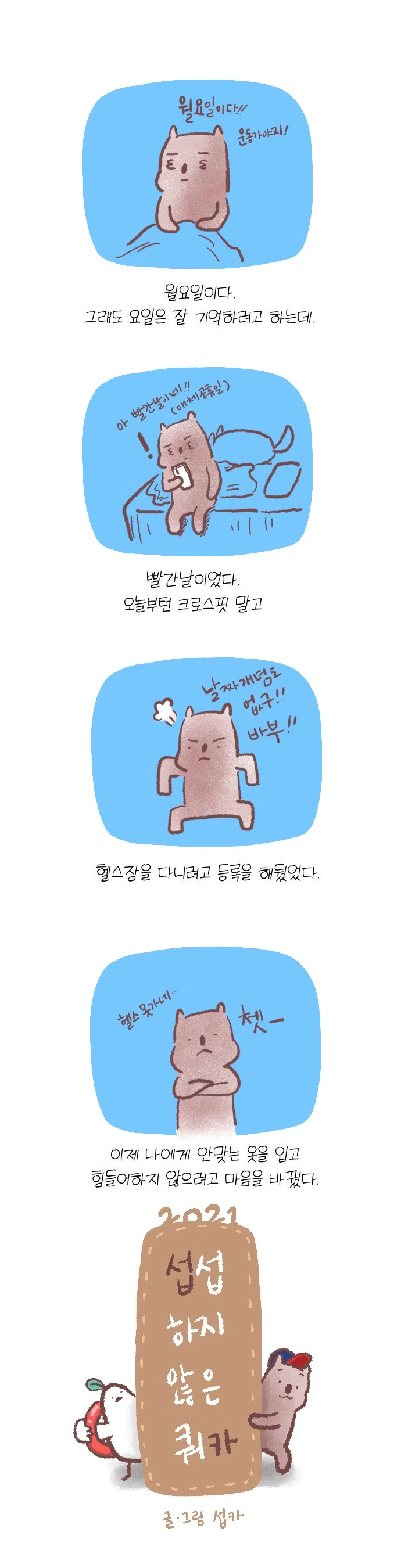 <섭섭하지 않은 쿼카>그림일기 웹툰 작가이자 운동을 좋아하는 일러스트레이터입니다. 따뜻한 그림을 그리고 싶습니다. 작가님의 글에 따뜻함을 더하고 싶으신분들은 제안해주세요.