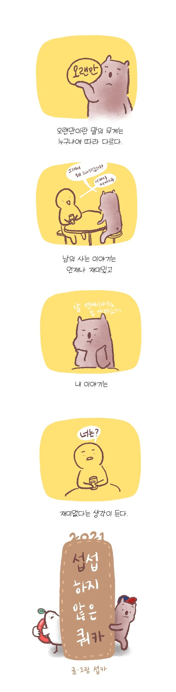 <섭섭하지 않은 쿼카>그림일기 웹툰 작가이자 운동을 좋아하는 일러스트레이터입니다. 따뜻한 그림을 그리고 싶습니다. 작가님의 글에 따뜻함을 더하고 싶으신분들은 제안해주세요.