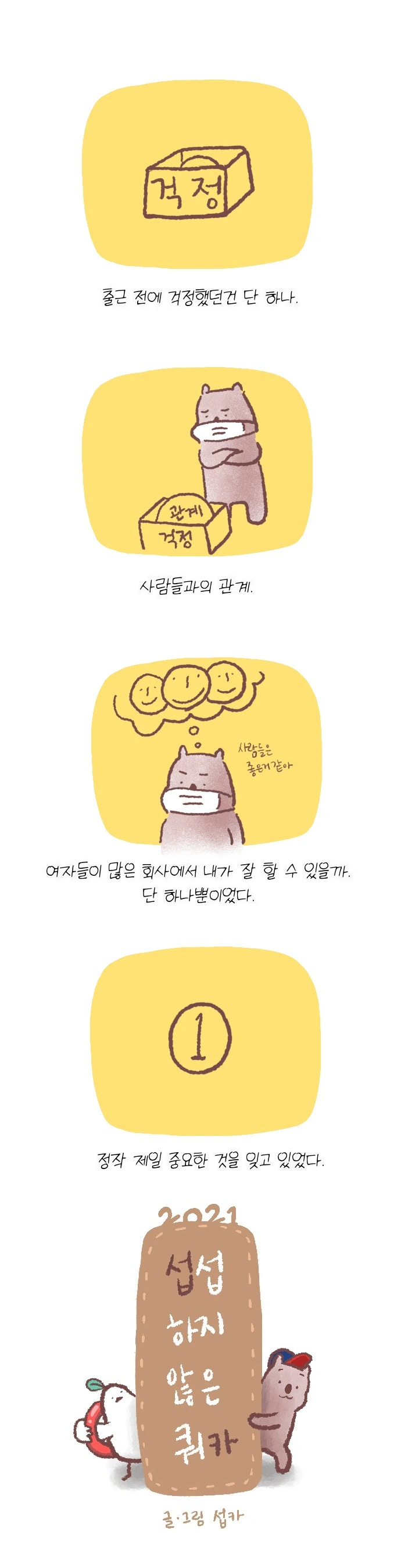 <섭섭하지 않은 쿼카>그림일기 웹툰 작가이자 운동을 좋아하는 일러스트레이터입니다. 따뜻한 그림을 그리고 싶습니다. 작가님의 글에 따뜻함을 더하고 싶으신분들은 제안해주세요.