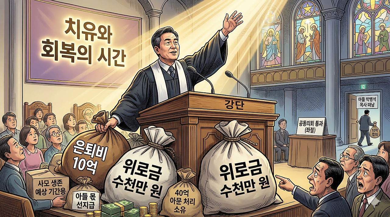 그의 이름이 언급된 뉴스를 보고 숫자를 되짚어 봐야 했다. 원로목사 사례비가 현직 담임목사보다 800만 원 많았다. 담임목사 연봉이 1억 3700만 원이었는데, 원로목사가 1억 4500만 원을 받았다. 은퇴한 사람이 일하는 사람보다 더 받는 직장을 떠올려 봤는데, 하나도 생각나지 않았다. 국회의원도 퇴직하면 받는 돈이 는다고 생각해 보라. 하지만, 목사는 은퇴하면 늘어나는 구조가 이상하지 않은가?.