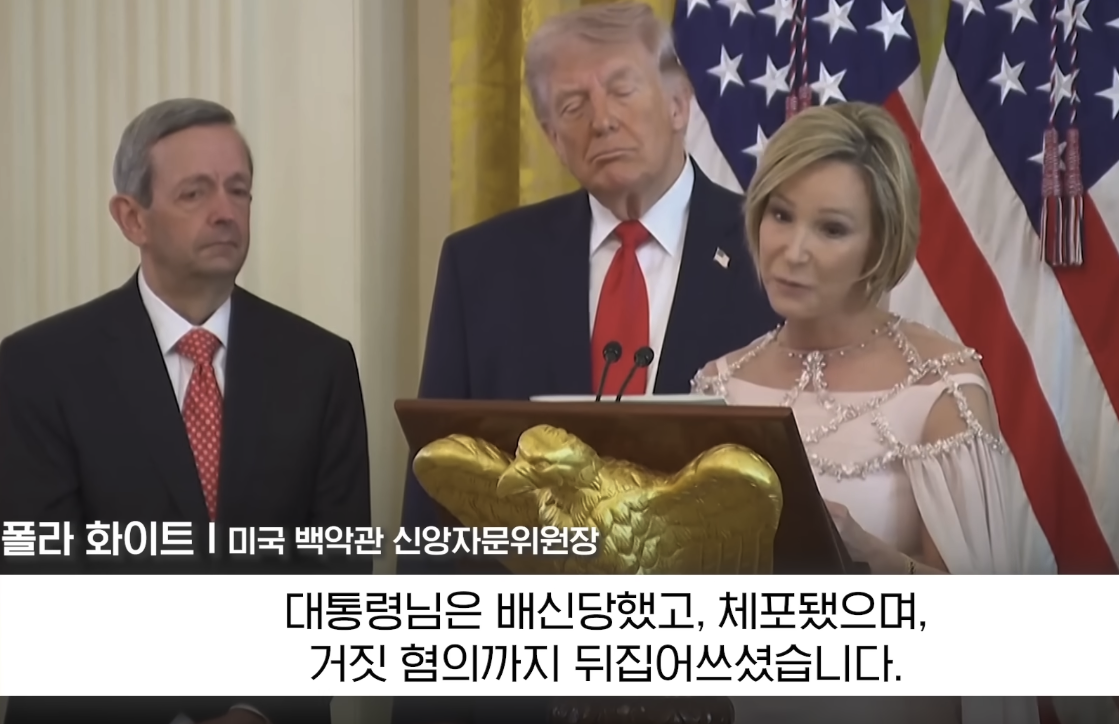 폴라 화이트 목사가 트럼프 대통령 바로 뒤에 서서 말했다. "당신은 배신당하고, 체포되고, 거짓으로 고발당했습니다. 이것은 우리 주님이 보여 주신 익숙한 패턴입니다." 부활절을 며칠 앞둔 4월 1일, 백악관 이스트룸에서였다. 트럼프는 무표정하게 서 있었고, 100여 명의 종교 지도자들은 그 자리를 지켰다.