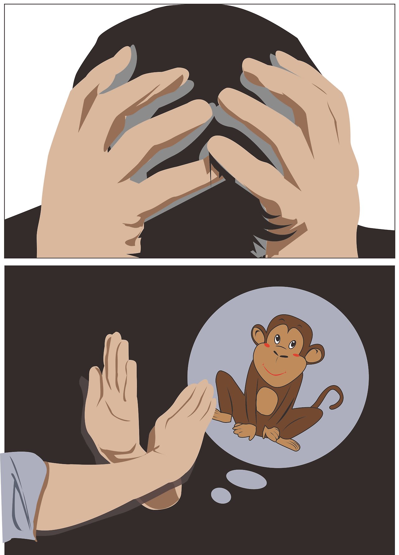 남자는 기뻐하며 그 조언대로 명상을 시작했다. 그가 사는 동네에는 원숭이가 있지 않을뿐더러 실제로 원숭이를 본 적도 몇 번 없었다. 원숭이를 생각하지 않으면 된다니, 이보다 쉬운 방법이 없었다. 그런데 눈을 감자마자 첫 번째로 떠오른 것이 원숭이였다! 생각하지 않으려고 할수록 더 나타났다.