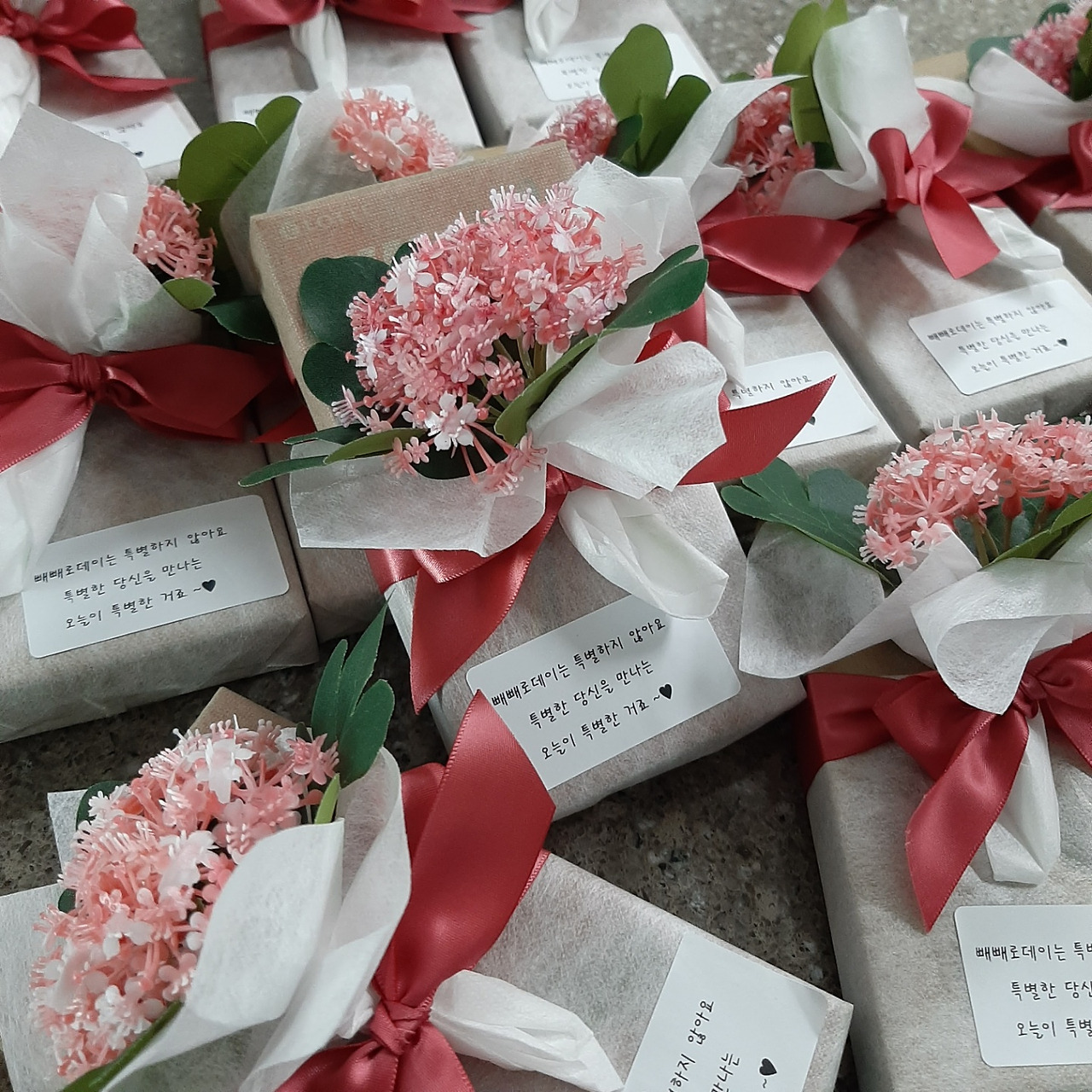 10월 말부터, 꽃집 아가씨는 빼빼로데이에 판매할 상품 준비로 정신이 없었다. 과자 상자를 종이로 싸고, 성글게 짜인 망으로 상자를 감싸고, 이미 초여름부터 잘 말려 준비해 놓은 작은 백일홍 꽃다발을 달았다. 그리고 그 위에 짧은 메시지를 리본으로 달아 완성했다.