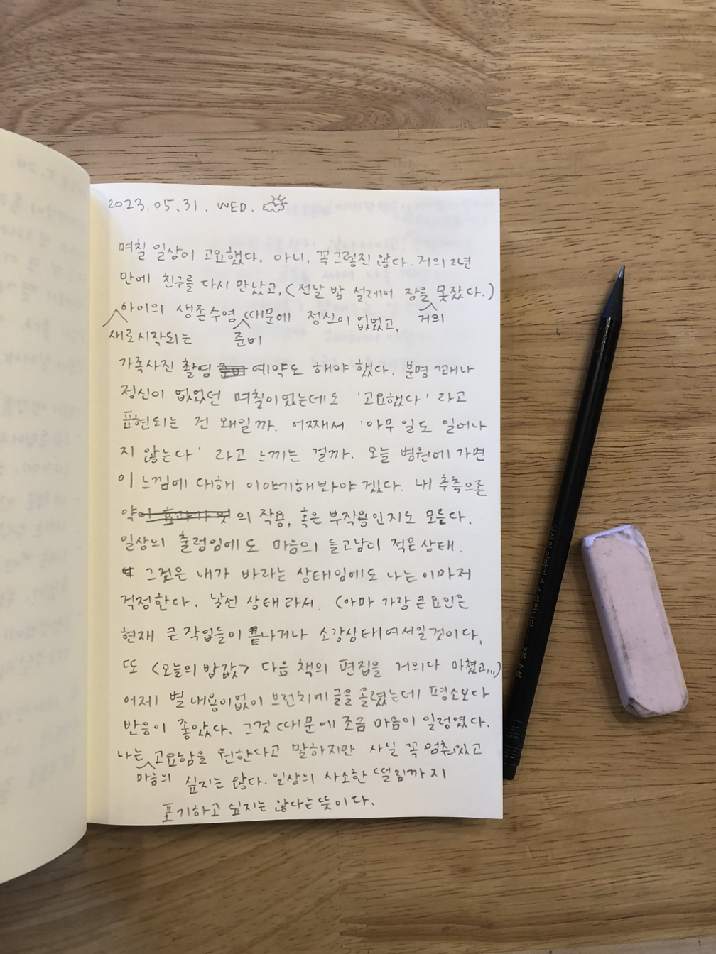 며칠 일상이 고요했다. 아니, 꼭 그렇진 않다. 거의 2년 만에 친구를 다시 만났고, (전날 밤 설레어 잠을 거의 못 잤다.) 새로 시작되는 아이의 생존수영 준비로 정신이 없었고. 가족사진 촬영 예약도 해야 했다.