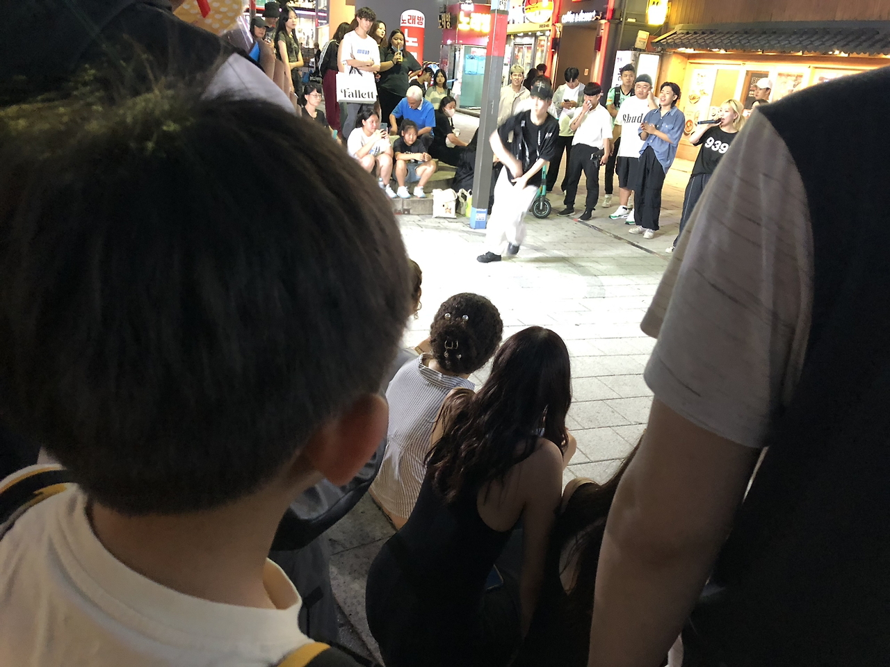 몇 년 전까지 혼자 칠푼이처럼 놀러 다녔던 이 길을 아이와 손잡고 걷는 밤이 어찌나 낯설고 신기하던지 한참을 조잘거렸다. 인파에 치이며 걷다 보니 만난 버스킹 현장. 아이가 유튜브에서만 보던 것을 실제로 보여줄 수 있어서 뿌듯한 순간이었다. 아이가 좋아하는 뉴진스의 <하입보이> 음악에 맞춰 춤을 추는 댄서들에게 박수도 힘껏 보내주고.